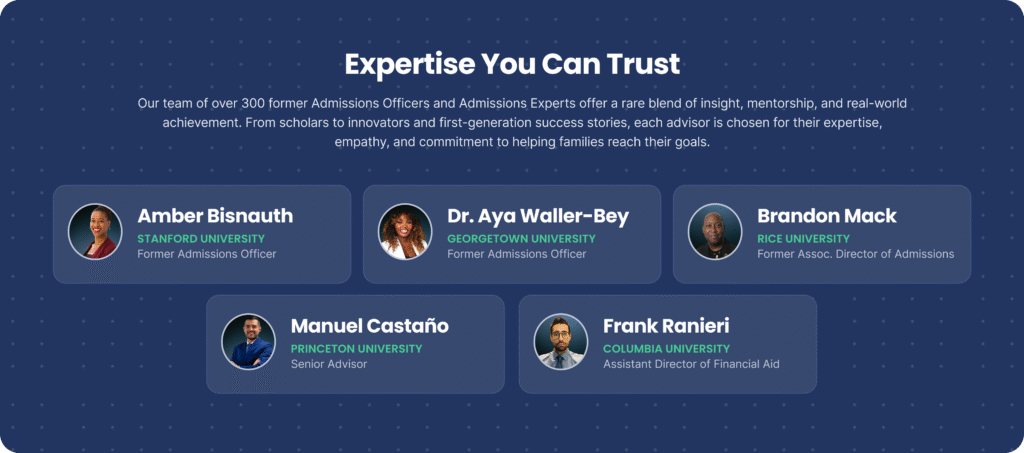 If you want to succeed in the college admissions process, you need expert support. Whether you have your sights set on the Ivy League or just want to find the best school for you, our team of 300+ Admissions Experts and former Admissions Officers is here to help.